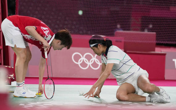 7月30日,陈雨菲为倒地的安洗莹捡起球拍。新华社记者李一博摄