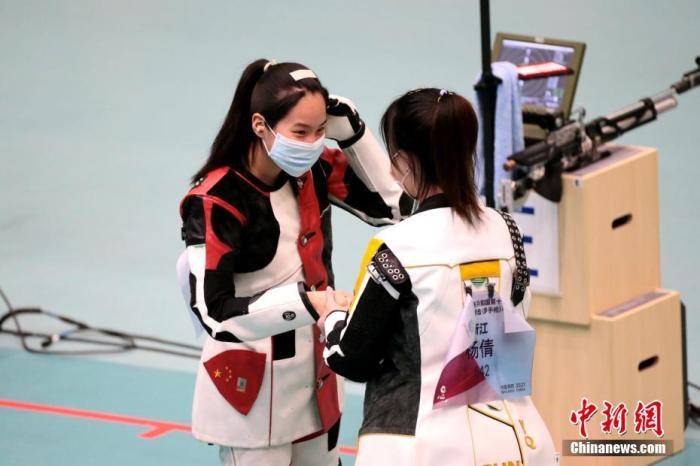 图为赛后杨倩(右)向王芝琳(左)表示祝贺。 中新社记者 张远 摄