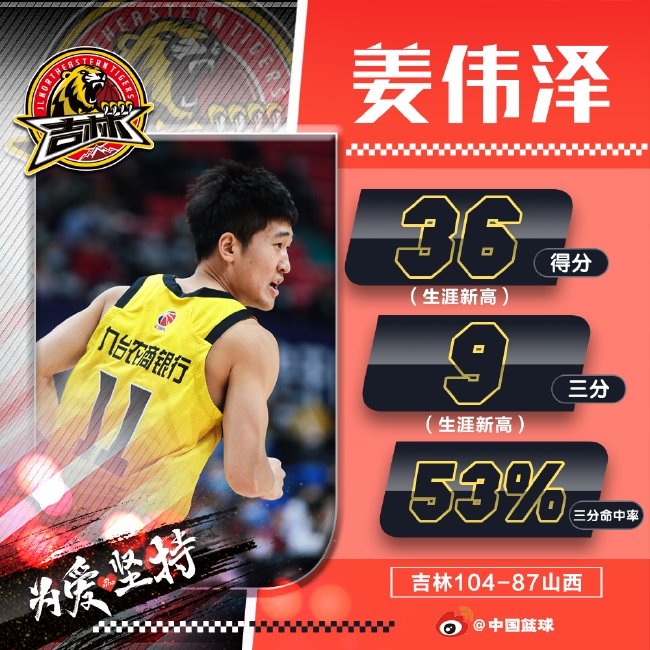 北京时间1月23日,CBA常规赛第26轮,吉林104-87大胜山西。吉林球员00后球员姜伟泽发挥出色,命中9记三分,砍下全场最高的36分。