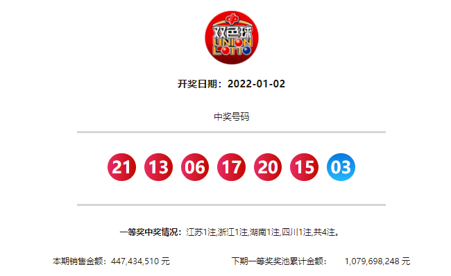 福彩开奖截图北京时间2022年1月2日,福彩双色球迎来第22001期开奖,同时也是2022年双色球的首期开奖。当期奖号为红球06 13 15 17 20 21,蓝球03,头奖开出4注1000万;本期双色球销量为4.47亿元,计奖结束后奖池余额10.79亿元。