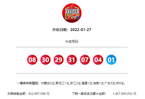 福彩开奖直播截图北京时间2022年1月27日,福彩双色球迎来第22012期开奖,当期奖号为:红球04 07 08 29 30 31,蓝球01,头奖开出9注730万。本期双色球销量为4.32亿元,计奖结束后奖池余额14.57亿元。