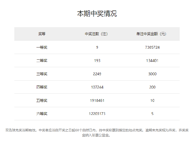 22:10 本期一等奖开出9注,单注奖金730万,其中内蒙古、浙江、广东各中出2注,黑龙江、福建、湖南各1注;二等奖开出193注,单注奖金13.4万。本期双色球销量为4.32亿元,计奖结束后奖池余额14.57亿元。