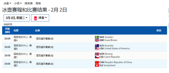 此次率先开战的冰壶混合双人赛,在2018年平昌冬奥会上成为正式比赛项目。中国混双组合范苏圆/凌智将在2日晚8时许,挑战2018年平昌冬奥会混双银牌组合,瑞士选手佩雷特/里奥斯。此后,中国队还将在循环赛中对阵澳大利亚、瑞典、加拿大、美国、挪威、英国、意大利和捷克等队。