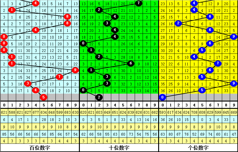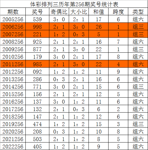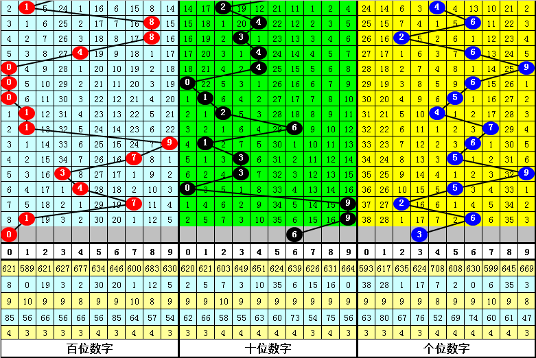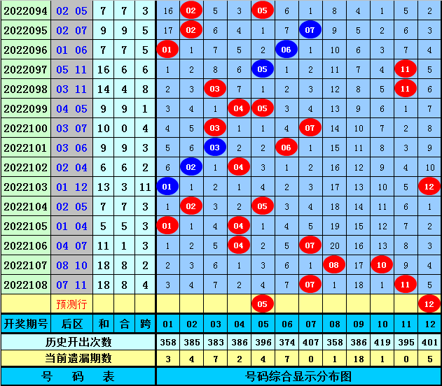 和值走势:上期奖号和值103,平均和值99.3,最近十期5次高于平均值,上期和值高于平均值,预计本期和值会下降,本期推荐和值在102左右。