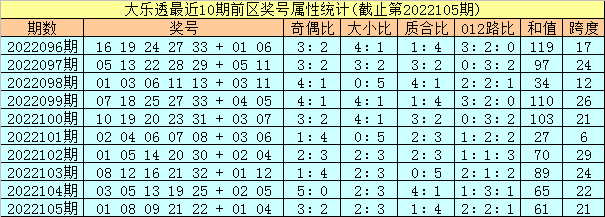 开奖回顾:体彩大乐透第22105期开出奖号为:01 08 09 21 22+01 04,前区大小比为2:3,012路比为2:2:1,质合比为1:4,奇偶比为3:2,后区大小比为0:2,012路比为0:2:0,质合比为1:1,奇偶比为1:1。