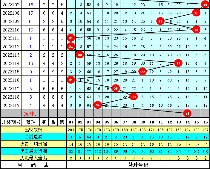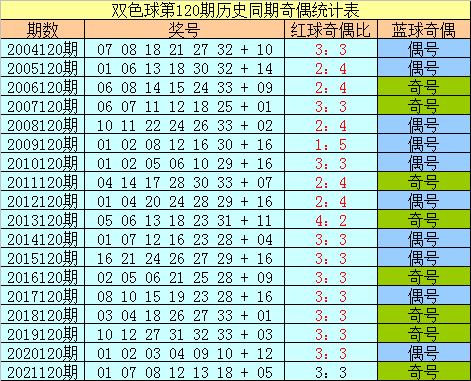 蓝球分析:在第120期历史同期开奖中,蓝球号码奇偶比为8:10,最近5年同期奇偶走势为:偶、奇、奇、偶、奇,今年同期注意偶数蓝球回补,关注号码14。