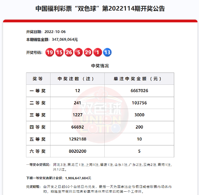 22:20 本期一等奖开出12注,单注奖金666万余元分落8地。其中河北中出3注,广东和云南各中出2注,黑龙江、上海、福建、山东和青海各中出1注。二等奖开出241注,单注奖金10.3万余元。本期双色球销量为3.47亿元,计奖结束后奖池余额19.86亿元。