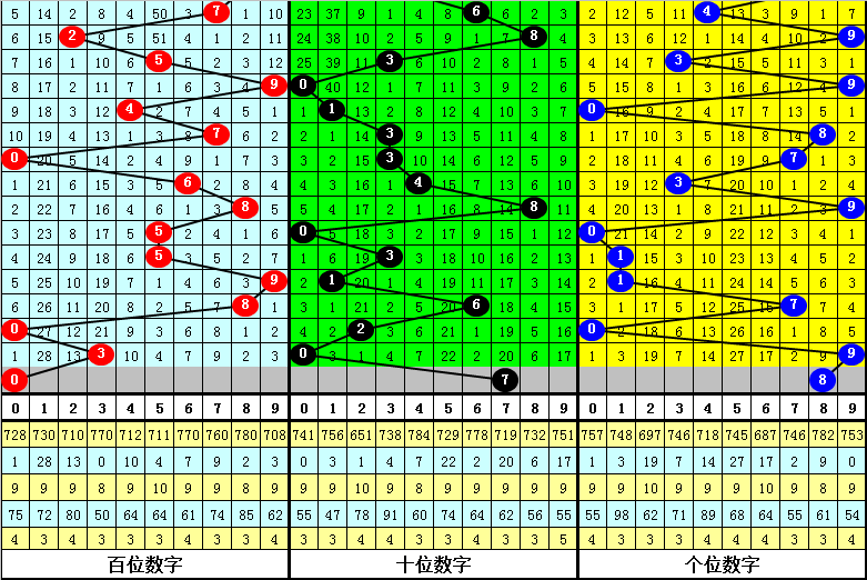 百位分析:上期出现号码3为:小号、质数,在连续9期开奖中,百位分别为:小号、合数:0;大号、合数:6;大号、合数:8;大号、质数:5;大号、质数:5;大号、合数:9;大号、合数:8;小号、合数:0;小号、质数:3,其中小号频次较少,合数开出频繁,百位本期预计开出小号、合数。