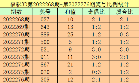 开奖回顾:福彩3D第2022276期:奖号为309,奖号质合比为1:2,大小比为1:2,跨度为9,类型为组六。