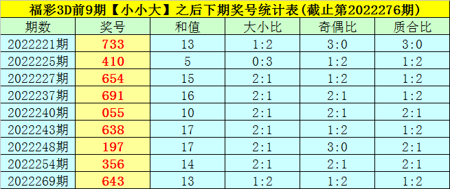 一、上期回顾:福彩3D第2022276期奖号为:309,奖号类型开出组六,大小比为1:2,奇偶比为2:1,和值为12,跨度为9,012路比为3:0:0。