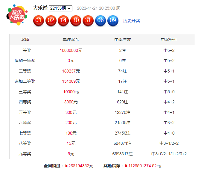 奖池方面,本期开奖结束后,10.41亿元滚存至12月3日(周六)开奖的第22138期。