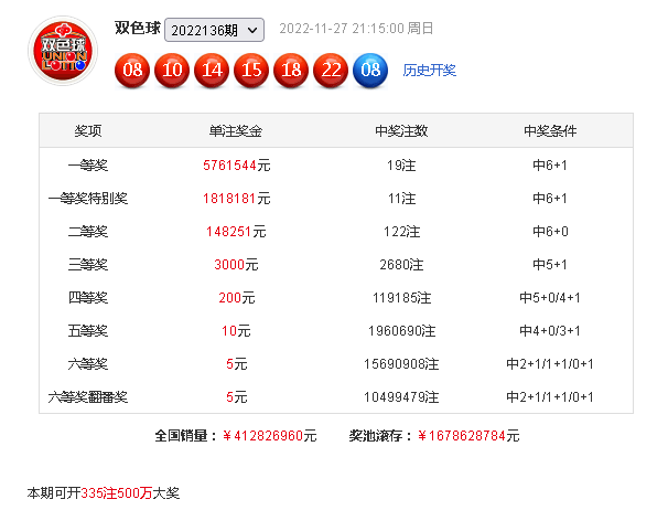 二等奖开出135注,单注奖金5.00万余元,其中69注采用追加投注,每注多得奖金4.00万余元,追加后,二等奖单注总奖金为9.01万元。