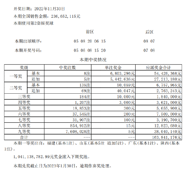 大乐透开奖直播截图北京时间11月30日晚,体彩大乐透第22137期开奖。当期开奖号码为前区05 06 08 15 20,后区07 08。本期全国销量为2.36亿元,为国家筹集彩票公益金8519万元。