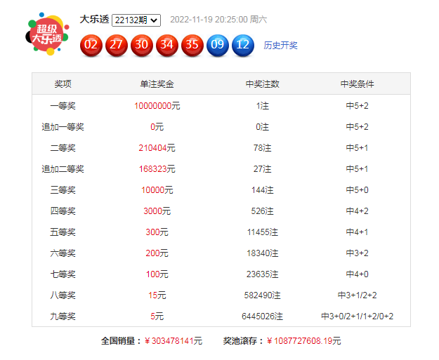大乐透第2022132期开奖,前区:02、27、30、34、35;后区:09、12。其中前区奖号012路比为2:1:2,大小比为4:1,奇偶比为2:3,后区为全0路组合。