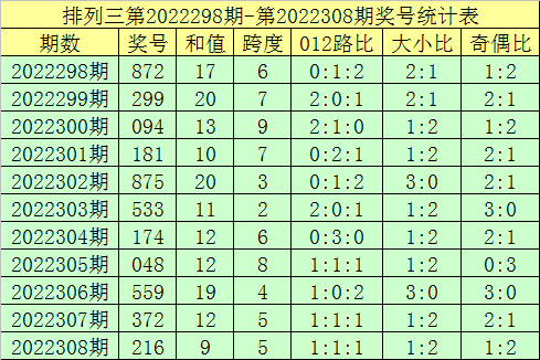 开奖回顾:排列三第2022308期奖号开出:216,组选类型:组六,大小比为1:2,奇偶比为1:2,和值为9,跨度为5。