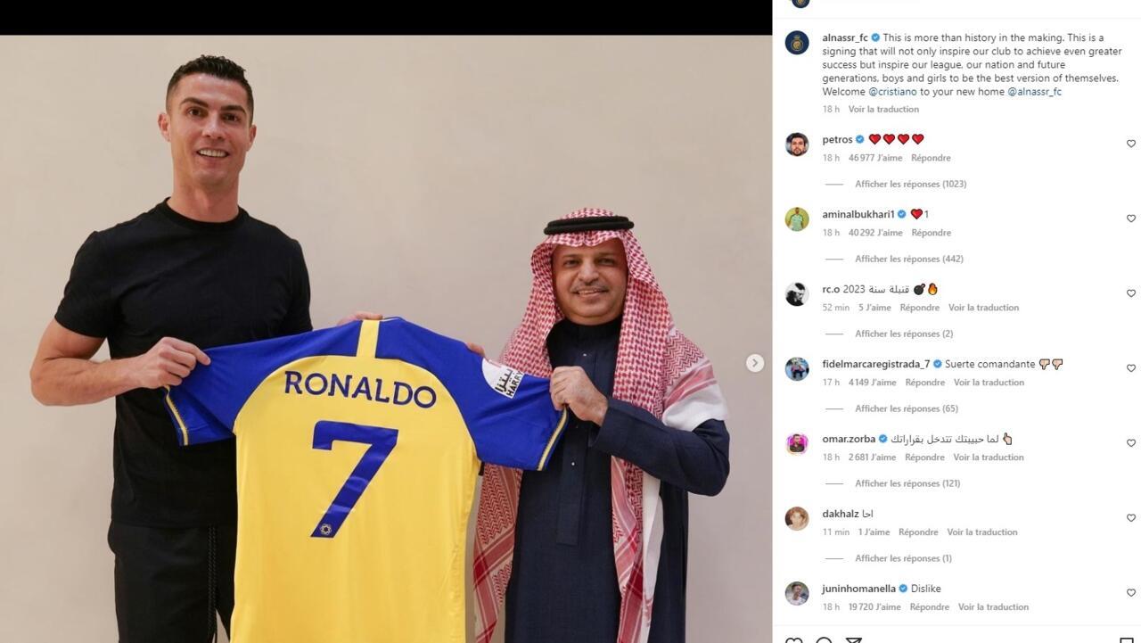 在罗纳尔多炫他的新纳赛尔球衣的照片下面,他在标题中写道:"一张载入史册的照片"。