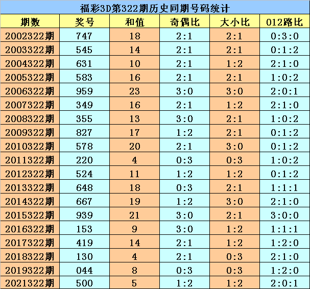 福彩3D第2022322期开奖日期:2022年12月2日,历史上第322期已开出了19次奖号,历年同期号码分别为:747、545、631、583、959、349、355、827、578、220、524、648、667、939、153、419、130、044、500。