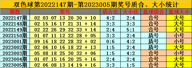 上期回顾:双色球第2023005期奖号为:02 06 08 13 14 19 + 16,红球质合比为3:3,大小比为1:5,蓝球为:合号、大号。