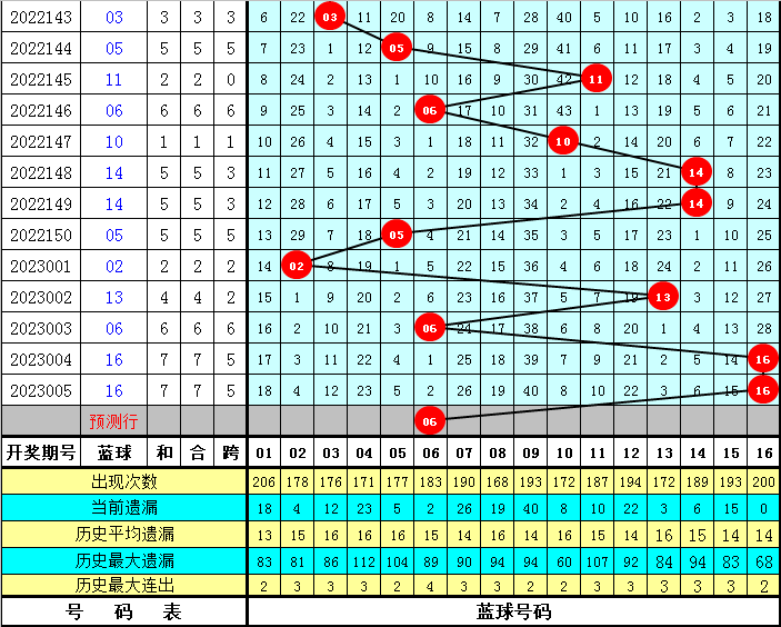 蓝球质合分析:上期蓝球16,为合号,合号蓝球开出次数较多,明显走热,短期内预计不会转冷,本期看好再次出现合号蓝球,关注蓝球06。