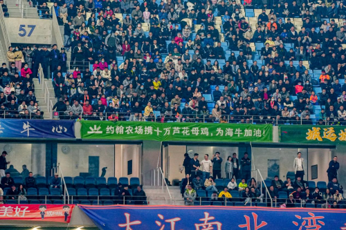海牛和国安的这场比赛,现场两张图片颇有意思,一张是看台上的一条横幅“约翰农场携十万芦花母鸡,为海牛加油”,另外一张照片是有人背着啤酒桶卖啤酒,15元一杯。