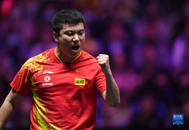 2023年4月14日,梁靖崑在比赛中庆祝得分。当日,在河南新乡举行的世界乒乓球职业大联盟(WTT)新乡冠军赛男单半决赛中,中国选手梁靖崑以4比2战胜中国台北选手林昀儒,晋级男单决赛。新华社记者李嘉南摄
