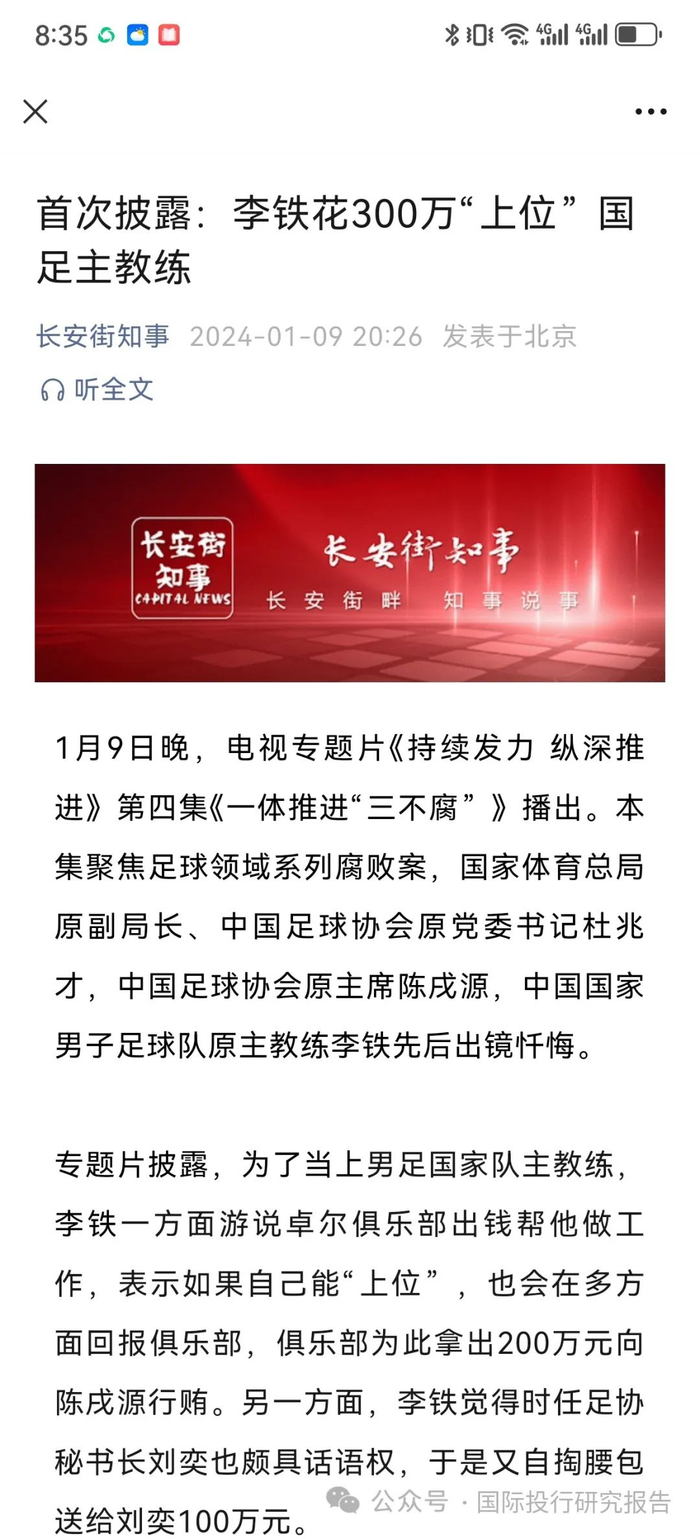 中国足球协会原主席 陈戌源:俱乐部给我送钱,跟我推荐。他说陈主席,李铁这个人不错,国家选拔队主教练(职务)为他的未来能够创造一个机会,创造一个平台。